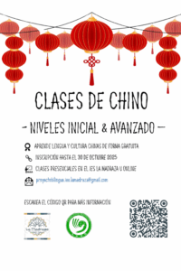Aún es posible matricularse en las clases de Chino que se imparten en el IES, los miércoles de 5.00 a 6.15 pm. Esta actividad GRATUITA está abierta tanto a alumnado y profesorado del IES, como familias y resto de la comunidad educativa.
