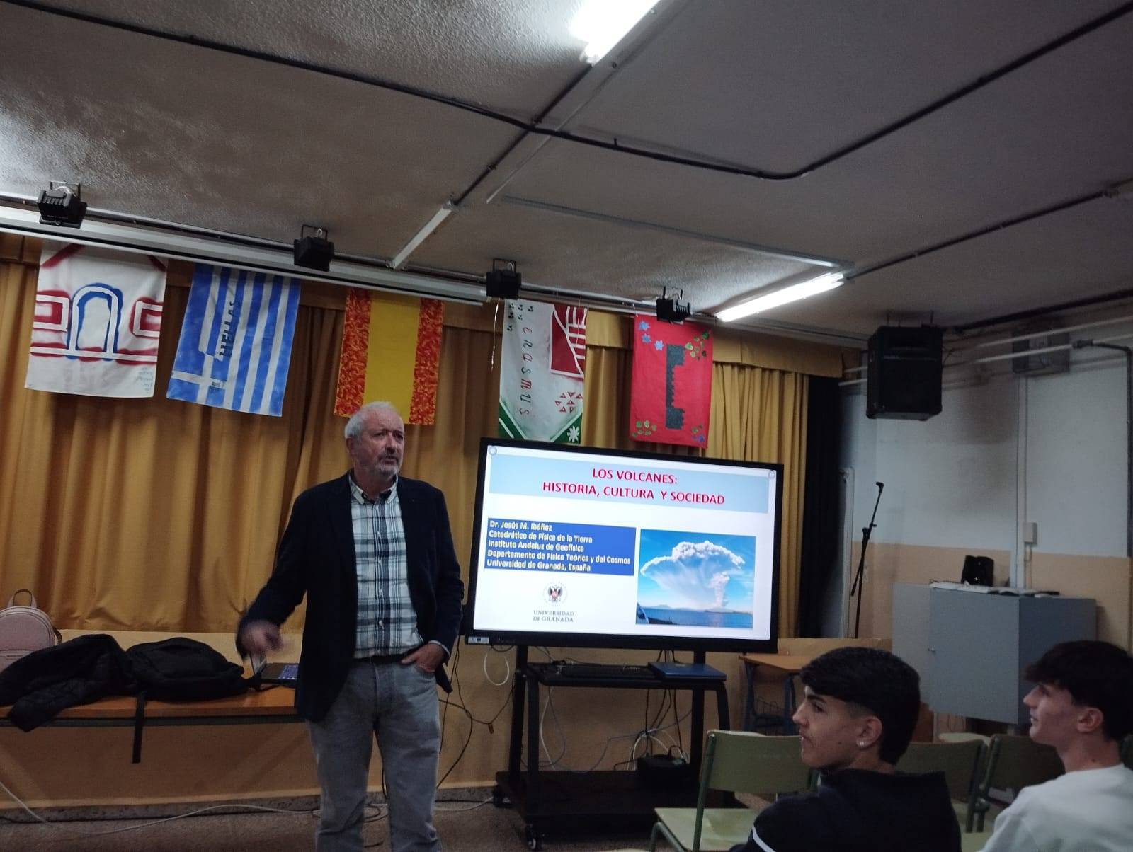 El catedrático en Geofísica de la UGR Jesús Ibáñez ha ofrecido charlas a grupos de ESO y Bachillerato bajo los títulos: «El origen del universo y la Tierra», y «Los volcanes: historia, cultura y sociedad».