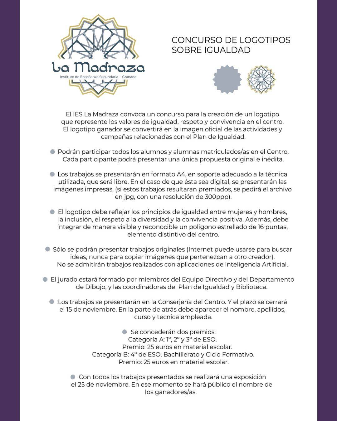 El IES La Madraza invita a su alumnado a participar en un nuevo reto creativo: diseñar un logotipo que simbolice los valores de igualdad, respeto y convivencia que guían la vida del centro.