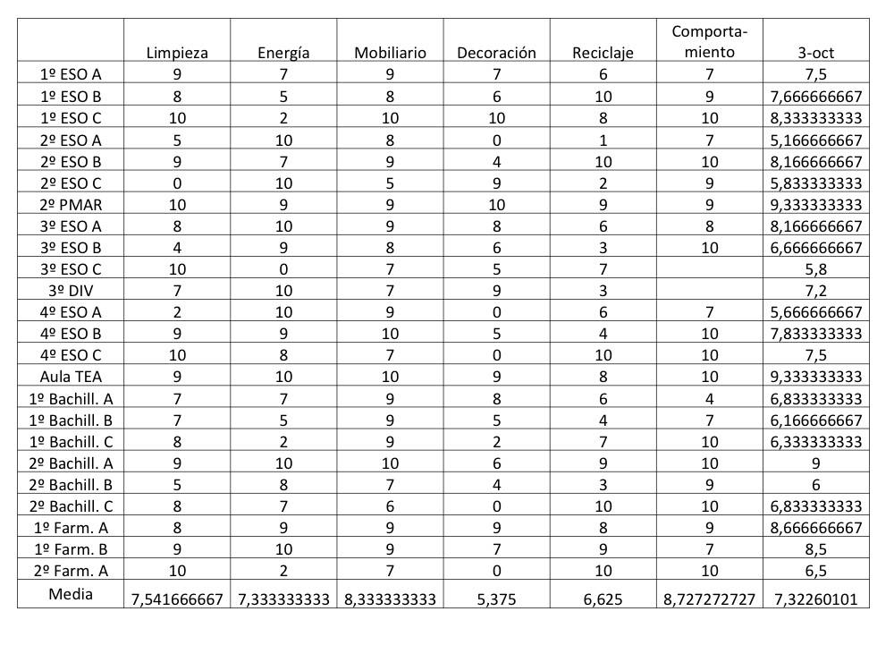 Presentamos los resultados de la revisión de aulas realizada el 3 de octubre. Destacan muy positivamente 2º PMAR, Aula TEA y 2º Bachillerato A. Entre los aspectos a mejorar señalamos la decoración de las aulas (algo lógico a principio de curso) y la separación correcta de residuos para su reciclaje. Animamos a que cada clase consulte la siguiente tabla para saber en qué tiene que mejorar. Esta primera revisión del curso ha sido realizada por alumnado de 2º Bachillerato: Alberto de la Osa, Claudia Donaire, Pablo García, Curro Gómez, Jorge Guillén, José Luis López, Gema López, Sara Marín, María Martín, Marcos Martínez, Alex Melguizo, Natalia Mengíbar, Julia Muñoz, Javier Valdivia y Jaqueline Zimmer.