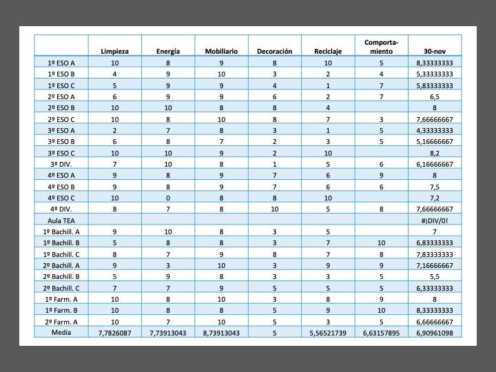 Presentamos los resultados de la revisión de aulas realizada el 13 de diciembre por Raya Atae-Allah, Issra Bachir, Rodrigo Gómez, Sofía Ruiz , Pilar Ruiz y Amina Zian (1º ESO). Insistimos en la importancia de mejorar la decoración de las aulas que influye en el bienestar dentro del aula y también en la separación correcta de residuos para su reciclaje.