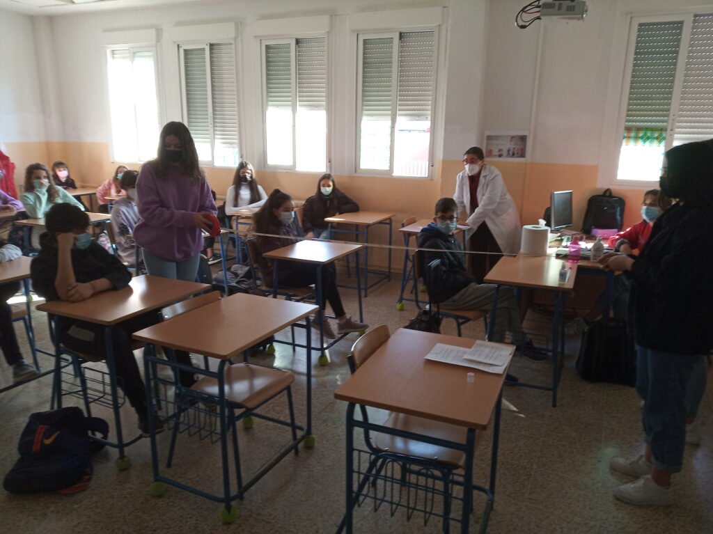“Experimento con aerosoles”. En este taller se muestra cómo la ventilación de las aulas influye en la velocidad de dispersión de aerosoles. Para ello usaron colonia cuyas partículas se propagaban por la clase de manea similar a como lo puede hacer un virus. El alumnado indicaba cuándo le llegaba el olor y se anotaban tiempos y distancias recorridas para luego determinar la velocidad de propagación, tanto con ventanas abiertas como con ventanas cerradas. Impartieron el taller Alejandra Cantero, Ana Cazorla, Pablo Cazorla, Beatriz Díez y Laura López (3º ESO A) y lo coordinó la profesora Conchi Reyes.