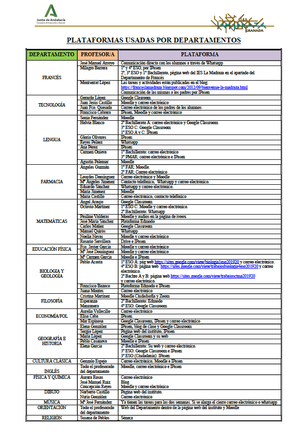 En la siguiente tabla se recogen las distintas plataformas y medios de comunicación que van a utilizar los departamentos y profesores para comunicarse con sus grupos. VER TABLA.