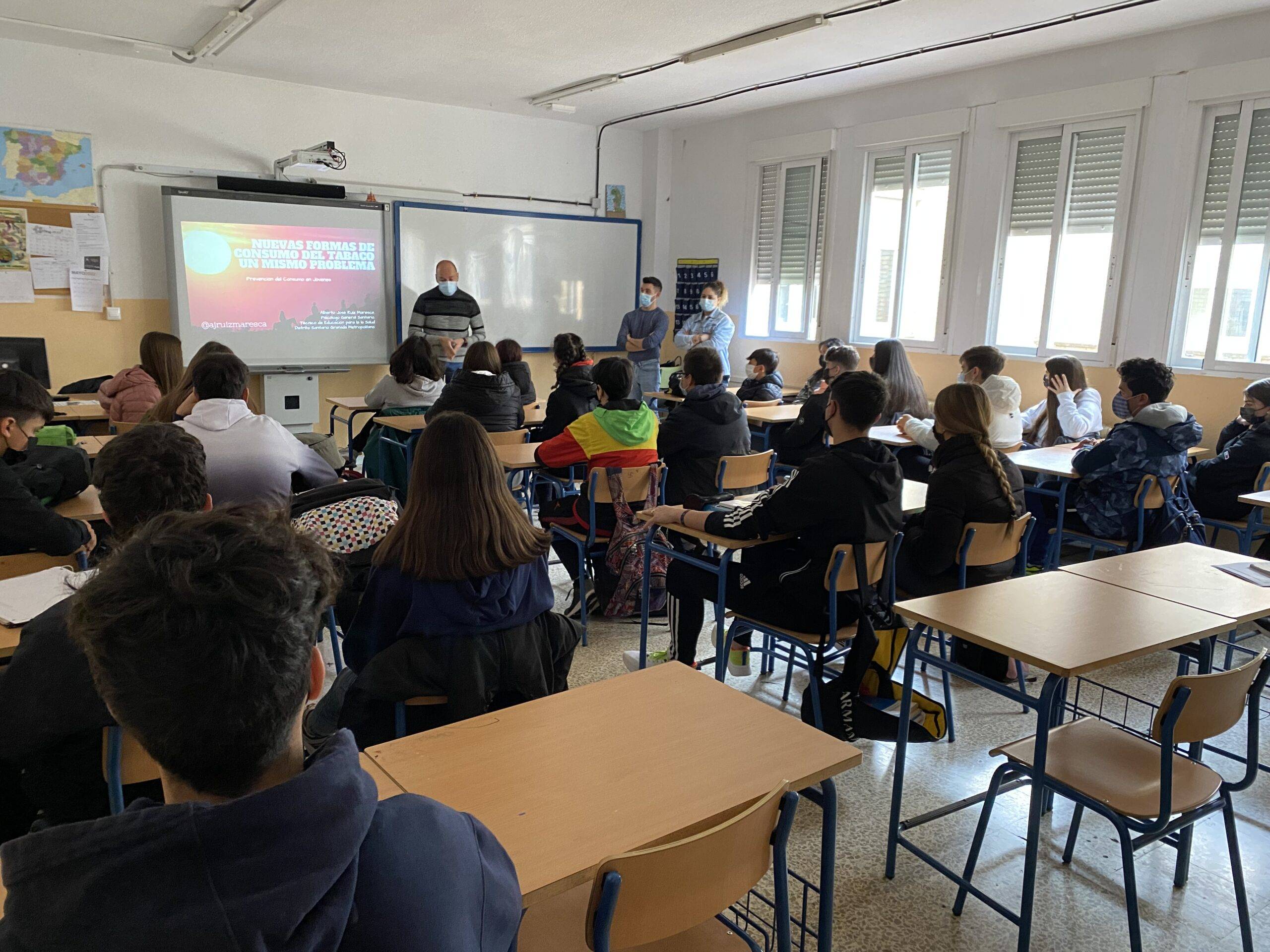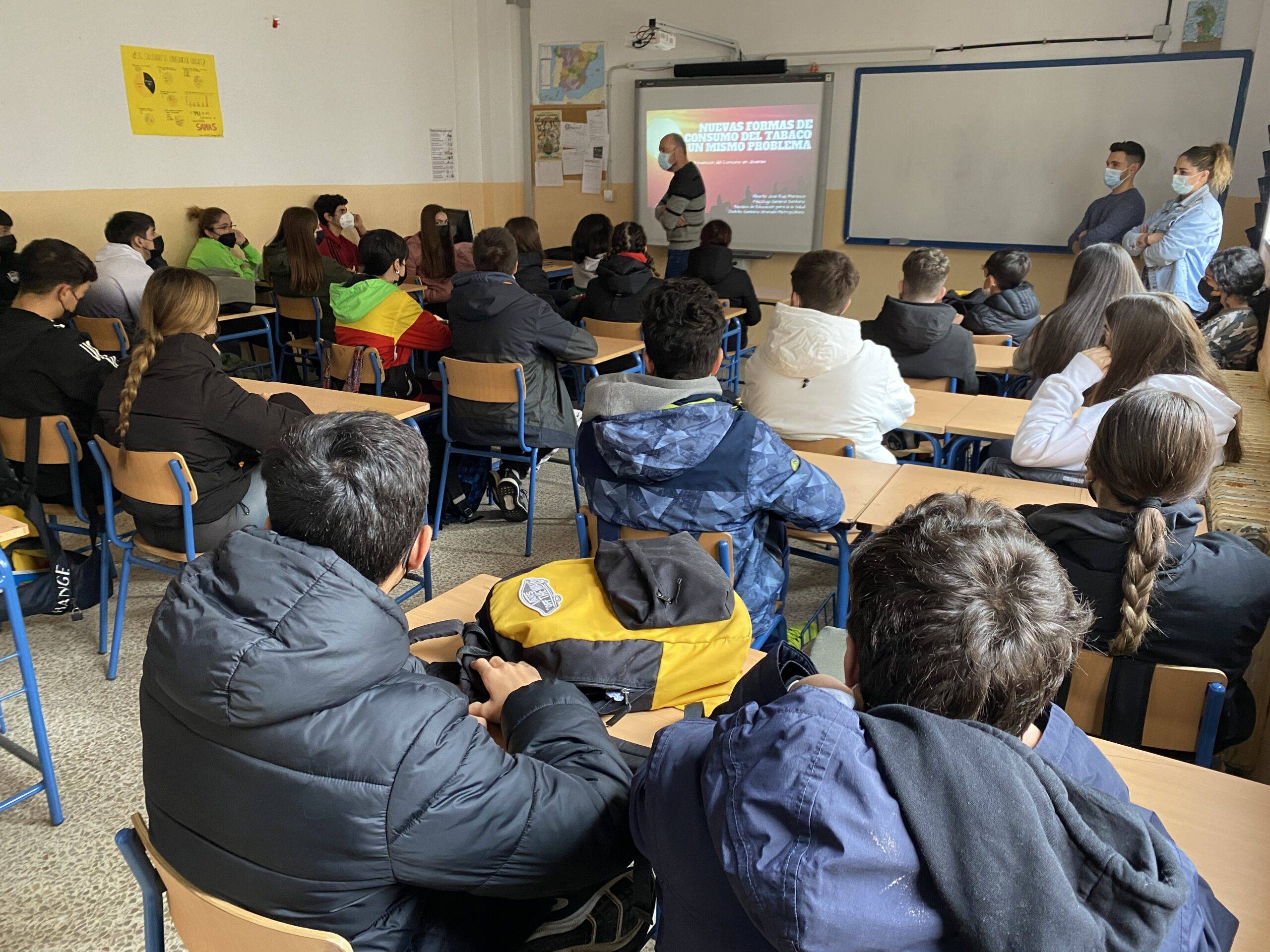 Hoy ha venido al IES La Madraza un equipo del SAS donde un psicólogo, técnico de educación para la Salud del SAS, Alberto J. Ruiz Maresca, ha estado con los alumnos de 4º ESO impartiendo un taller de Formajoven sobre “las Nuevas formas de consumo del tabaco, un mismo problema”. El alumno ha podido escuchar los falsos mitos sobre cachimbas, resolver dudas de la misma o sobre el vapeo entre otras.