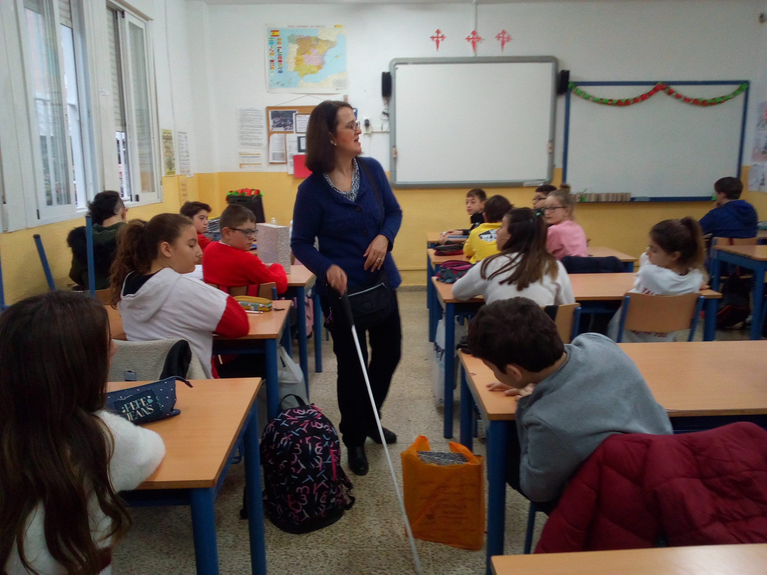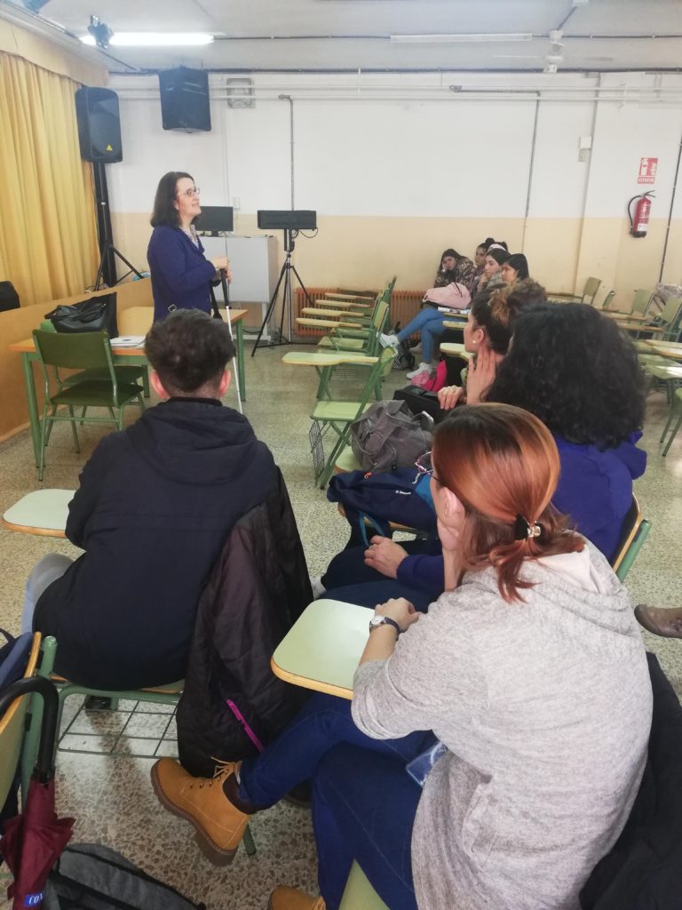 Para dicha conmemoración, en el Departamento de Orientación estimamos conveniente invitar a una persona con discapacidad y ayer nos visitó Inmaculada Ortega Castillo, una mujer invidente, afiliada a la ONCE, que vino a expresar su testimonio y a hacer visible su discapacidad. Ella fue profesora en un Instituto, hasta que tuvo que dejar su profesión debido a su enfermedad.